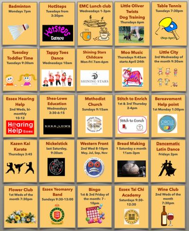 The Hall is host to a wide range of community events and clubs, including Table Tennis, Badminton, Wine Club, Flower club, and Coffee club. Kids Clubs include Karate, Dance, Moo Music, Toddler Time, Little City, Shea-Lowe Education and many more.