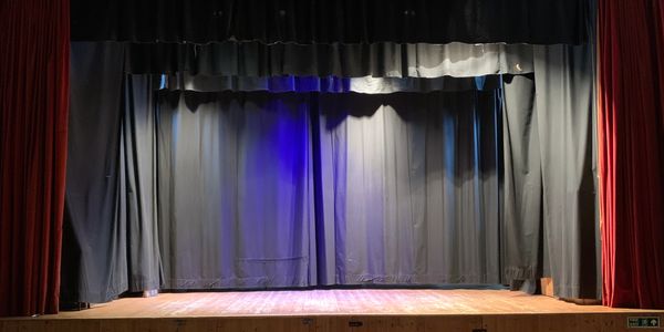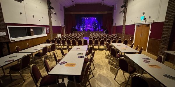 The Stage is lit by 4 lighting bars and Hall-side spot lights, which are Lighting-Desk/DMX controllable; basic on/off stage lighting is available as default, which includes Spot-lights and Glitter-ball Lights. The stage is 4.6m wide between the tabs and a maximum 6.6m wide and 4.8m deep. There is cross-over access back stage, a changing room, small wings and a kitchenette with tea/coffee microwave and sink.